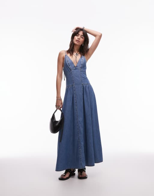 Topshop - Mellemblå maxikjole med rynker og sømdetaljer i denim
