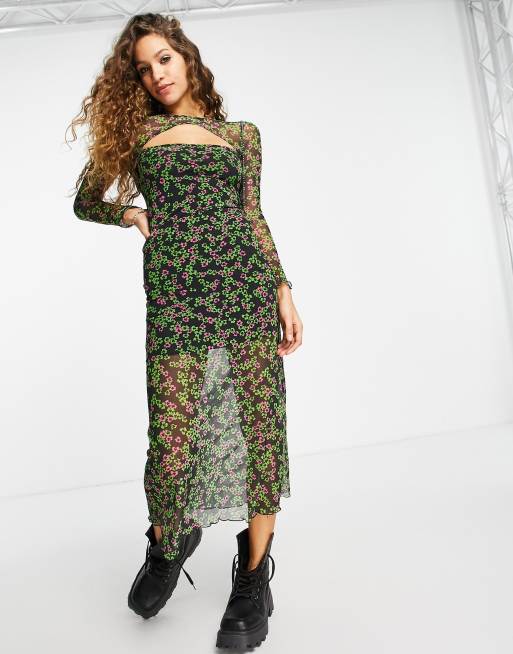 Topshop - Midikjole med udskæring i grøn og lyserød blomstret mesh