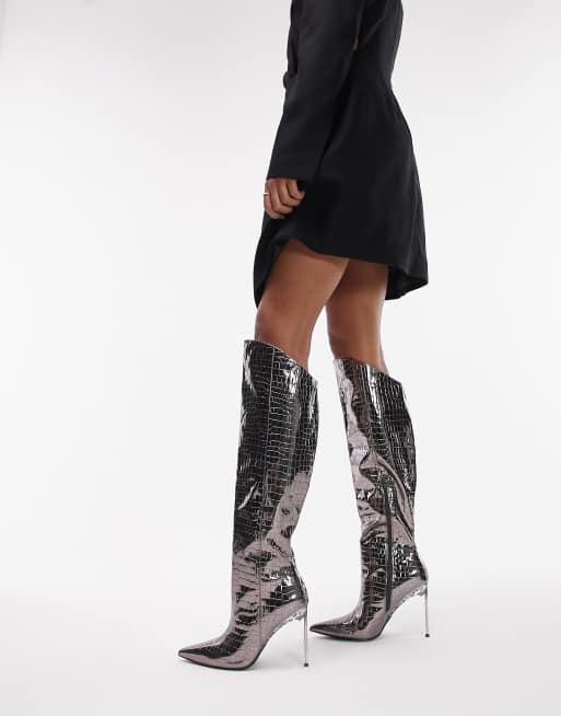 Topshop - Milo - Tinfarvede lårhøje støvler med høje hæle