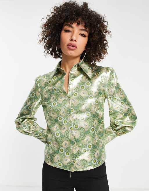 Topshop - Mintgrøn skjorte med 70'er-krave og metalfarvet blomsterprint