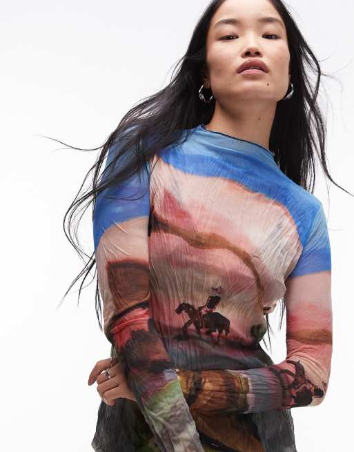 Topshop - Multifarvet overdel med lange ærmer og cowboy-motiv i krølstof
