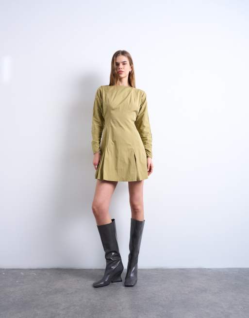 Topshop - Olivengrøn minikjole med struktur og flagrende sømkant
