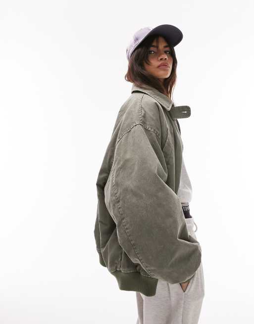 Topshop - Oversized bomber-jakke med krave i vasket kakigrøn