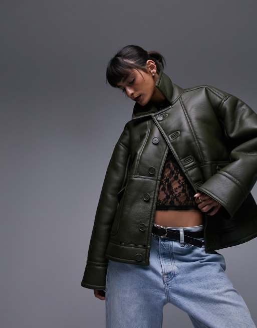 Topshop - Oversized kakigrøn kørejakke i imiteret læder og imiteret lammeskindsfor
