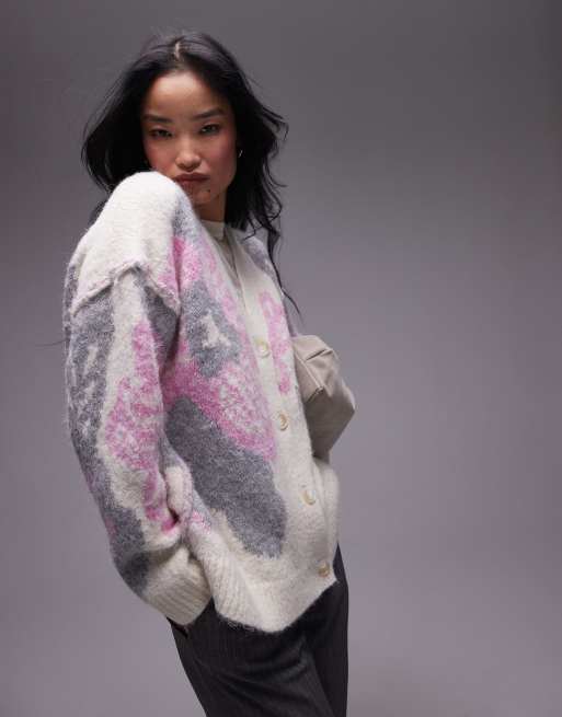 Topshop - Oversized strikket cardigan med blomstermønster i neutral farve