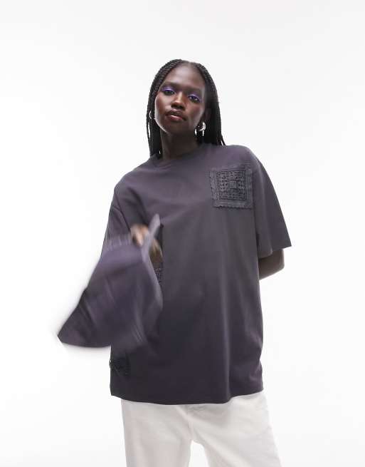 Topshop - Oversized T-shirt med hæklet lap i koksgrå