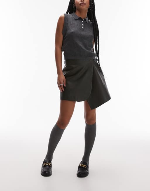 Topshop Petite - Mørk kakigrøn slå-om-mininederdel i imiteret læder