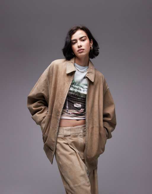 Topshop - Premium - Oversized og sandfarvet bomber-jakke i ægte blød ruskind