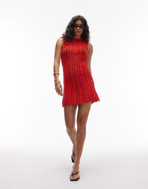 Topshop - Premium - Rød håndstrikket hæklet minikjole