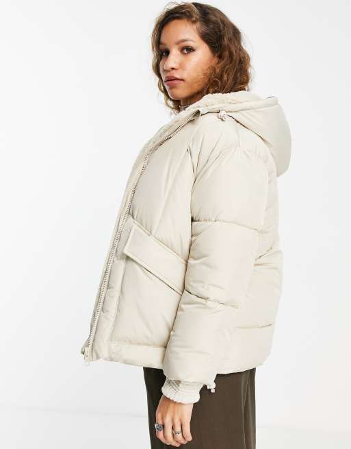 Topshop - Råhvid mellemlang dynejakke med hætte med plysfor
