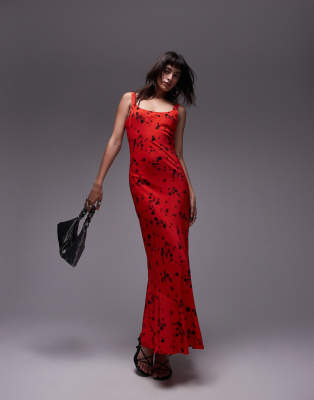 Topshop - Rød slip-midikjole med blomstermønster og trompetkant