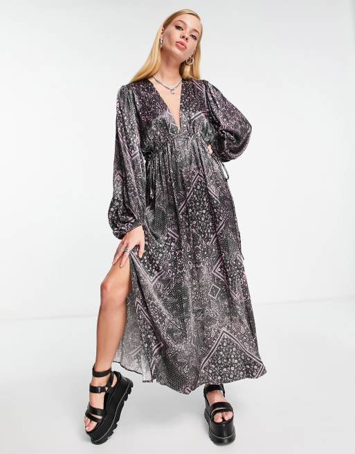 Topshop - Satin-midikjole med ærmedetalje i multifarvet med pailsey-mønster