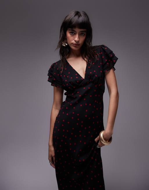 Topshop - Sort kjole til særlige lejligheder med flagreærmer og røde prikker