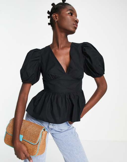 Topshop - Sort peplum poplin-bluse med pufærmer