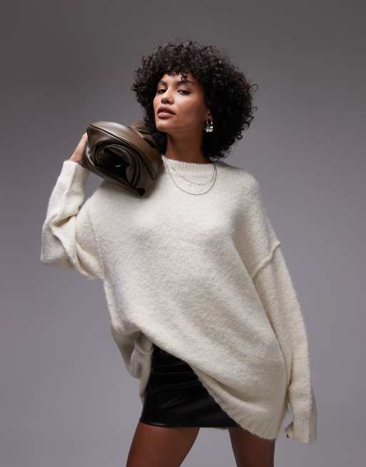Topshop - Strikket og plysset hvid longline-trøje med rund hals