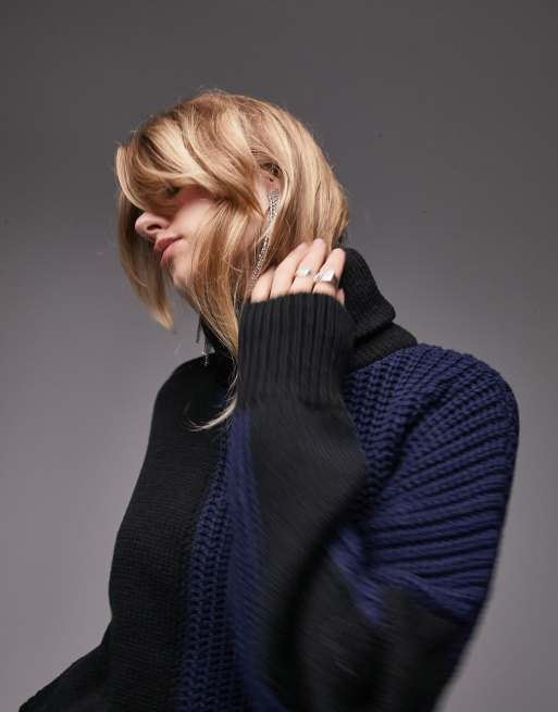 Topshop - Strikket trøje med rullekrave og farveblokke i marineblå