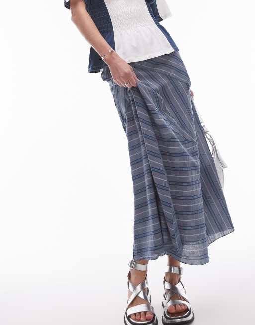 Topshop Tall - Indigoblå midinederdel med multifarvede striber og asymmetrisk design