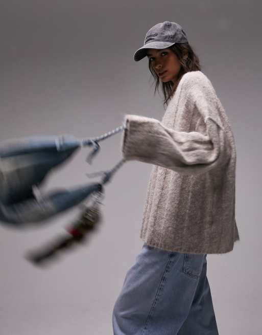 Topshop - Vamset, løstsiddende og beige trøje i bred ribstrik med synlige sømme