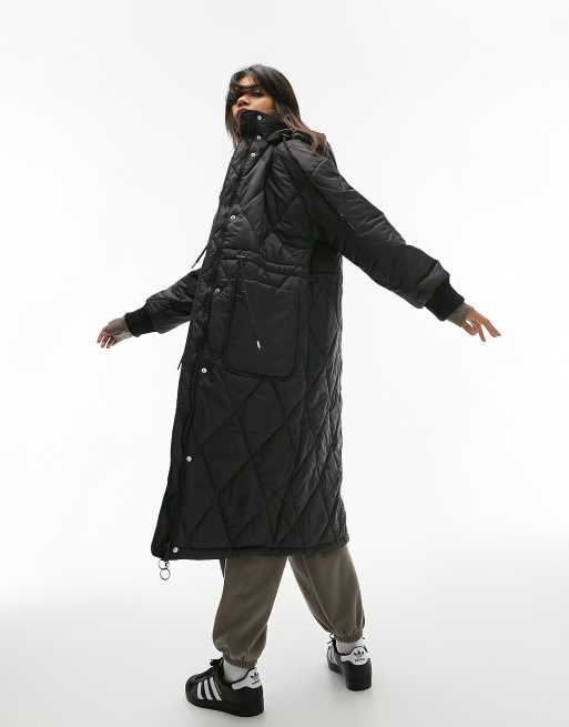 Topshop - Vatteret longline-dynejakke med hætte i sort