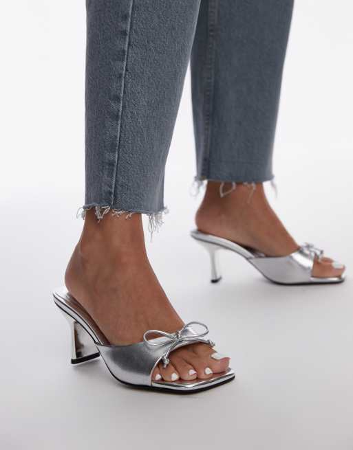 Topshop - Wide Fit - Gem - Sølvfarvede mules med høj hæl og sløjfe