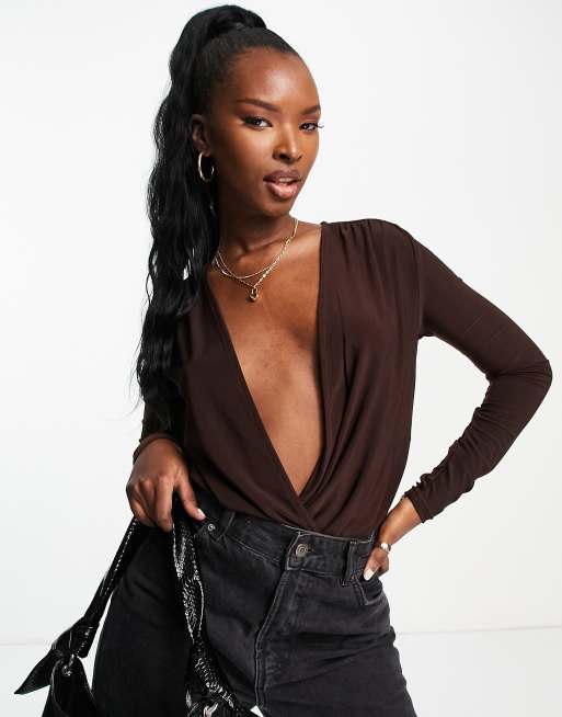 Trendyol - Brun langærmet bodystocking med plunge-front