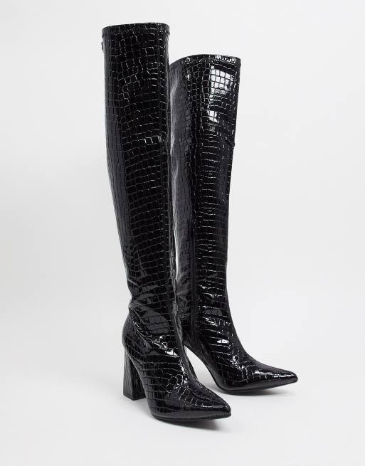 Truffle Collection - Spidse knæhøje støvler med hæl i sort krokodillemønster