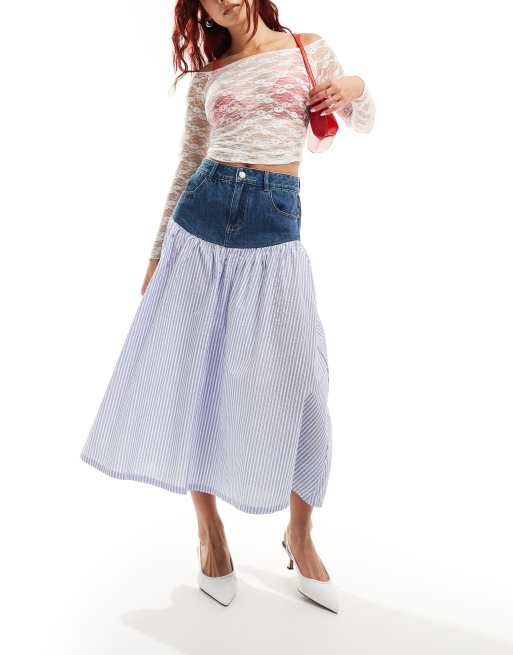 Urban Revivo - Stribet blå midaxinederdel med denimdetalje