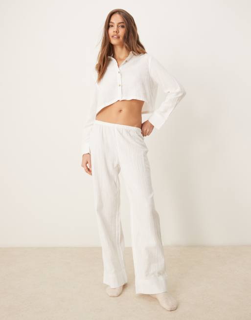 Urban Threads - Cremehvidt pyjamassæt med langærmet croptop med knapper og bukser i boksershorts-stil med vaffelstruktur