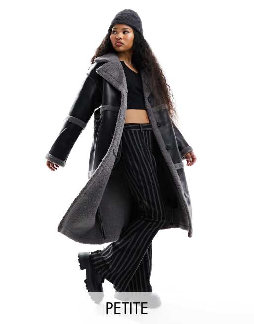 Vero Moda Petite - Longline-maxifrakke med imiteret lammeskind i sort