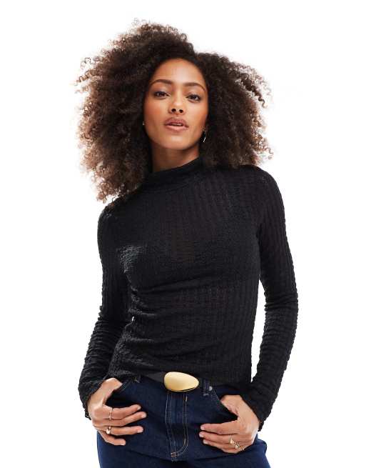 Vero Moda - Aware - Sort top med tekstur, høj hals og lange ærmer