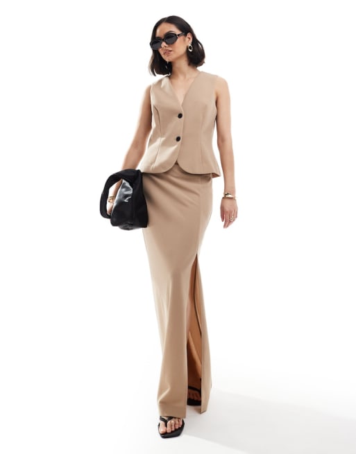 Vero Moda - Beige og skræddersyet sæt i jersey med habitvest og maxinederdel med slids