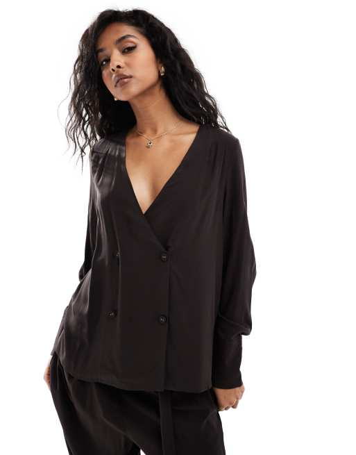 Vero Moda - Chokoladebrun dobbeltradet satinskjorte - Del af sæt