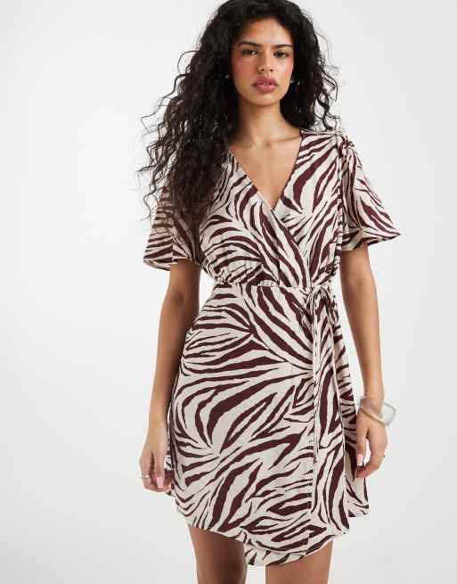 Vero Moda - Chokoladebrun minikjole med zebraprint og flagrende ærmer samt slå-om-design foran