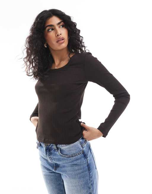Vero Moda - Chokoladebrun ribstrikket top med lange ærmer