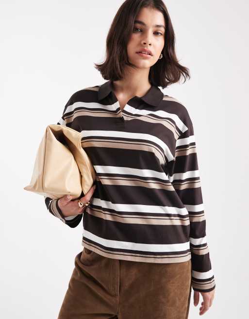 Vero Moda - Chokoladebrun rygby-top med afslappet pasform og hvide og beige striber