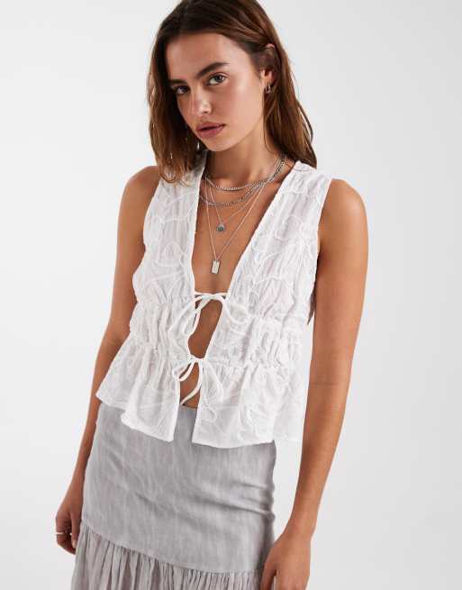 Vero Moda - Hvid bluse med peplum-kant og bindebånd foran samt blomsterbroderi