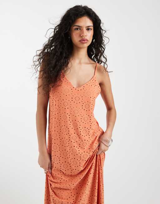Vero Moda - Orange midikjole i jersey med blomsterbroderi og camistropper