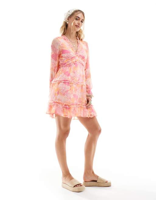 Vero Moda - Smilla - Lyserød smock-minikjole med flæser og sløret blomstermønster