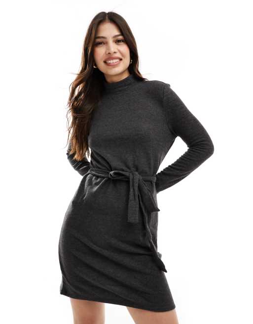 Vero Moda - Sort og meleret minikjole i strik med høj hals og bindebånd i taljen