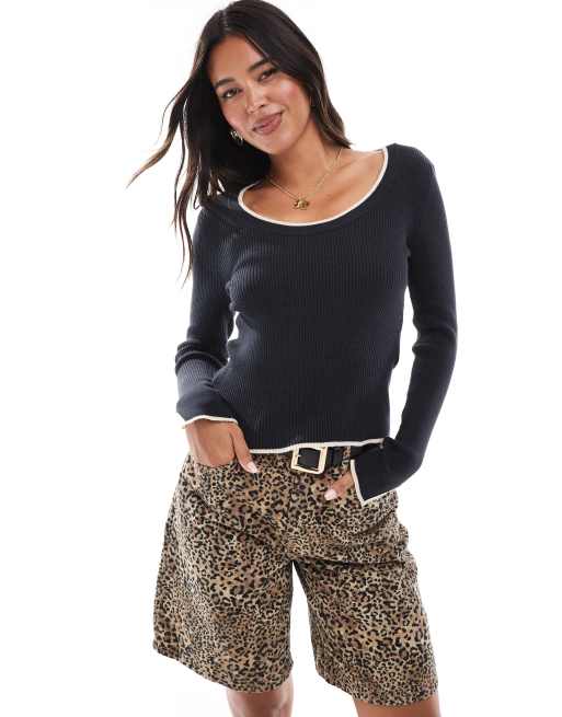 Vero Moda - Sort top i strik med U-formet hals og kantbånd i kontrastfarve