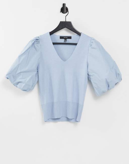 Vero Moda - Strikket top med v-hals og pufærmer i lyseblå