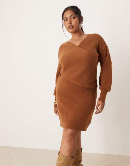 VILA Curve - Kamelbrun slå om-kjole i minilængde i strik