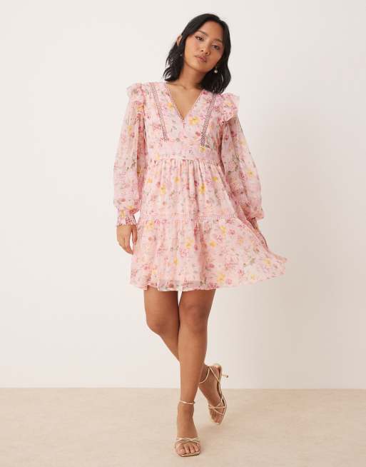 VILA Petite - Ferskenfarvet minikjole med stigeblonder og flæser i blomstermønster