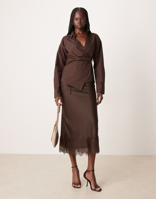 VILA - Chokoladebrun maxinederdel i satin med blondekant