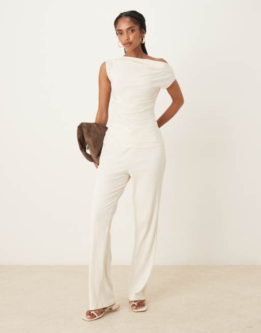 Vila - Cremehvide ribstrikkede bukser med vide ben - Del af sæt