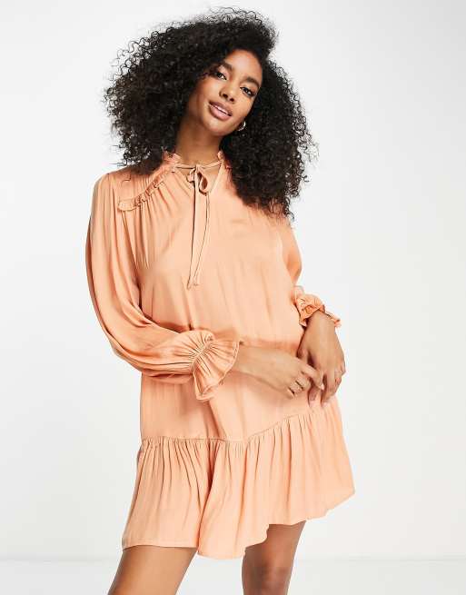 Vila - Ferskenfarvet smock-minikjole i satin med bindebånd i halsen