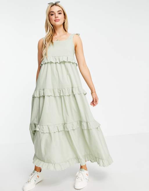 Vila - Lagdelt maxikjole i salviegrønt bomuld