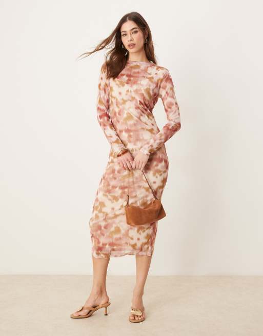 VILA - Langærmet råhvid midikjole i mesh med udtværet rosa print
