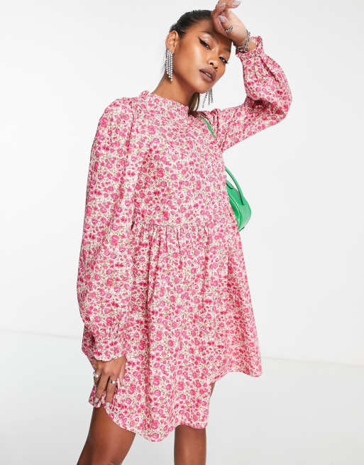 Vila - Pink langærmet smock-minikjole med print