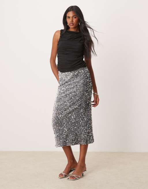 Vila - Sølvgrå maxinederdel i velour med pailletter